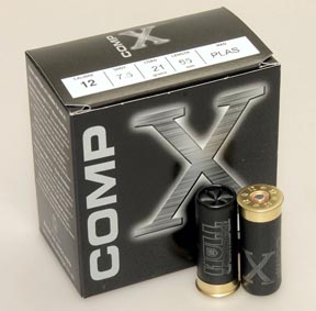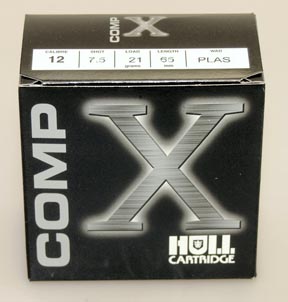 Delivered in a black and silver version of Hull’s familiar Comp-X range, complete with the usual minimal information band, the new 21 gram load now signifies the company’s switch to Cheddite cases. Shorter in appearance, each cartridge measures an exact 52mm inclusive of the 7mm brass head. Overprinted in silver, the cases are finished off with a deep rolled six-point crimp.