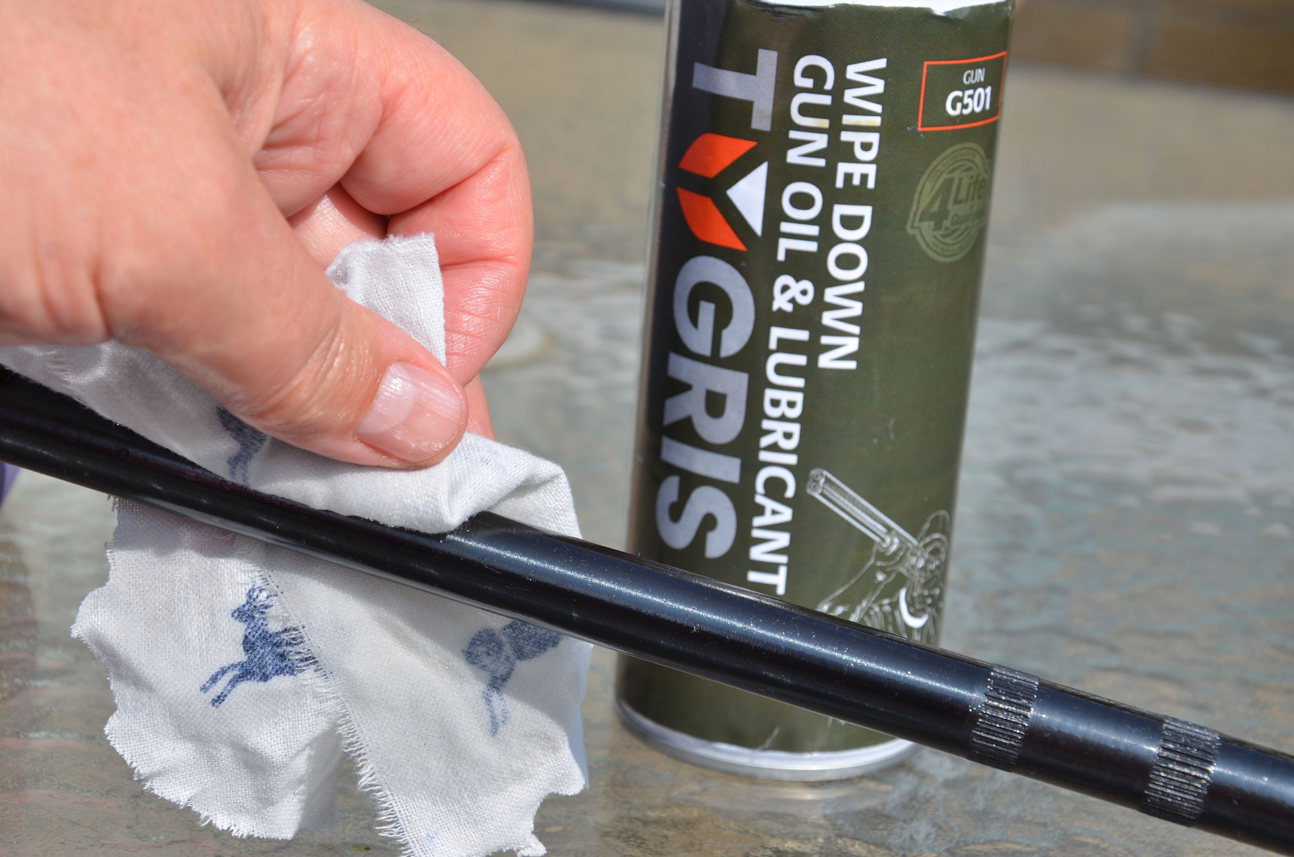 Using the Tygris Wipe Down Oil on a cloth to clean the exterior of a rifle.