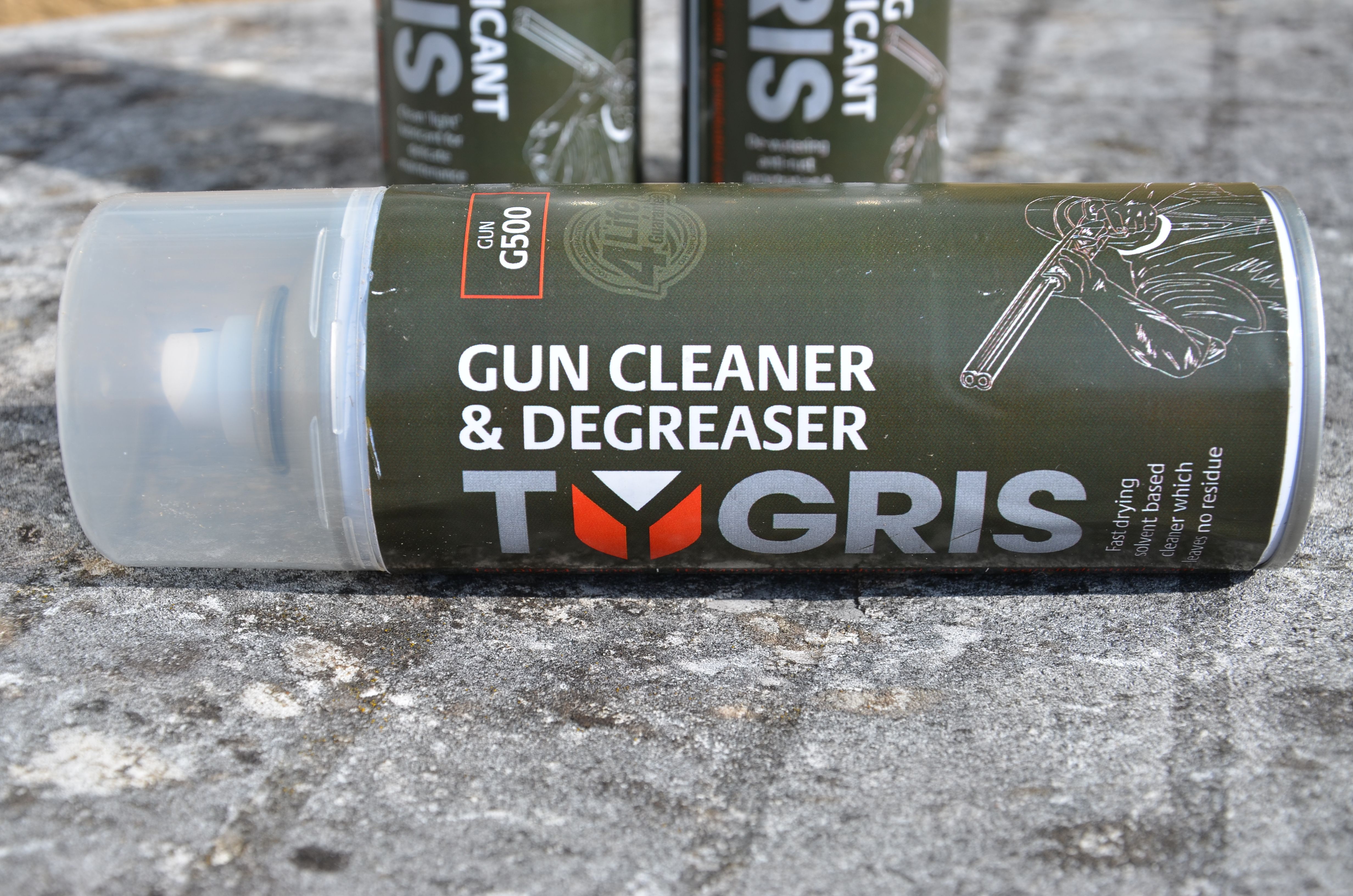Finally, there’s Tygris Gun Cleaner and Degreaser. This provides a powerful solvent cleaning action, breaking down contaminants and leaving no residue. On test, this one worked a treat. It comes out as a fine spray and evaporates in seconds. It also degreases almost on contact. It’s very effective and easy to use.