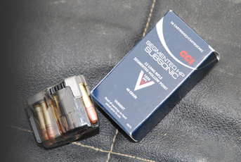 The ammunition is copper-coated and shows a decent sized hollow point cavity which we are told is generating 1050 fps/98 ft/lbs. Testing used a 16” Browning T-Bolt rifle with PES MM22 moderator. Accuracy was compared with Winchester and SK subs and found to be about the same with ½ - ¾” groups at 50-yards and around the inch at 100 with a drop of about 4”. Like these two it proved good medicine for small game! Over the chrono the SHP showed a wide extreme spread (ES) at 51 fps with a low of 981 and a high of 1032 fps.