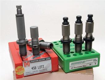 Reloading dies were easy to find, I had a set of Redding Series B for the 458 Win Mags and Hornady Custom Grade for the 458 Lott. Both are 3-die sets with full-length sizer, neck expander and bullet seater/crimp. Full-length sizing is sensible for reliable feed and chambering, the seater can handle lead or jacketed bullets and the expander die flares the neck just enough to ease a soft lead bullet in.