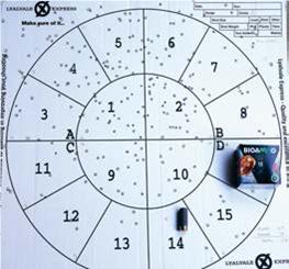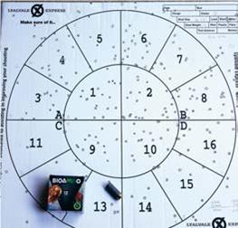 The patterns produced by the ¼ choke were lovely, as they were well centralised and evenly dispersed, with pellet hits right from the centre that then radiated outwards. We had a total of 257 pellets on the board and literally every corner or sector was hit. This was a good start and the outer sectors had the majority of the pellets, as expected, with 183 strikes. The remaining 74 pellets hit the inner 15”. Overall, a great pattern.