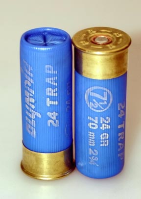 Imported by Mid Wales SG, like the rest of the Olympia range, the 24 Trap is delivered in distinctly individual, informative carton. Each blue plastic case with silver overlaid printing is an exact 56mm in length that incorporates the 12mm head and a deep set uniform six point crimp. Internally, an average of 23-21 grams or 286 perfectly spherical 7½’s are contained within what would appear to be Olympia’s rather unusual plaswad in that the slightly shorter shot cup sits atop a diametrically opposed cushion and a deep stippled over-powder cup. Beneath that, a mean average of 1-17 grams of circular cut, flat green, fast burn propellant exhibits precision production with no hint of clogging.