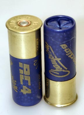 Each of the blue and gold cartridges is clearly overprinted leaving the user in no doubt as to what he or she is about to chamber. Manufactured from Cheddite cases each is exactly 55mm long inclusive of the deep 19mm RC stamped brass head. Sealed with a deep rolled six point crimp each cartridge contains on average 27-95 grams or 346 pellets of high antimony 7½’s with only the occasional mis-shape. A deep 15mm fibrewad and unusually broad 7mm over powder wad separates shot from the clearly defined green disc cut fast burn propellant and Cheddite primer. Construction wise, these RC’s are some of the best quality cartridges I’ve used of late.