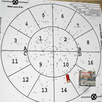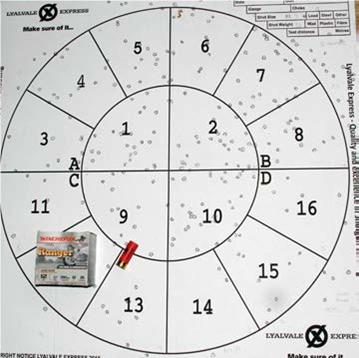 Now switching to the ½ choked barrel, we saw the ammo come alive with really good dense patterns. Total shot count was now 313 pellets, with a really good and even spread and great pattern density too. Around the circumference were now 165 strikes and the inner sectors now had a whopping 148 hits! These started right from the centre of the pattern and radiated out so there was no space for game or clay to hide. It’s not often you get a very good density right from the centre of the pattern board. Often you can have a void in the area that to me seems to be the most important point, this Ranger cartridge was smack on and true.