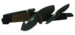 Knives are retained by a friction grip in the mouth of the sheath and also a fiip-over, double loop rubber strap goes over the end of the handles. The belt loop is a rigid, nylon hanger and removable should you wish. It’s good to see that Gerber have put as much effort into the carrying system as they have the knives themselves. Often this is in an area that is overlooked by manufacturers.