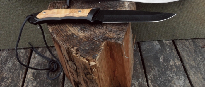 The Miguel Nieto olive wood fixed blade knife has olive wood handles (obviously!) and is supplied pre-sharpened and with a very good quality leather sheath. The five-inch-long blade is black, except the sharpened edge where the steel is visible; there is no guard, just a broadening of the handle where it meets the blade. The straight back blade retains its full thickness almost all the way to the tip, making it very strong. The handle is an alloy frame with olive wood inserts and the fit between materials is spot on.