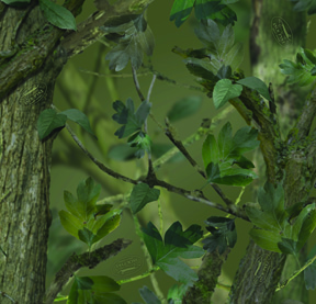The colours are fairly muted and the tonal range is wide, from pale grey greens through rich greens, all on a brown base of varying tone.