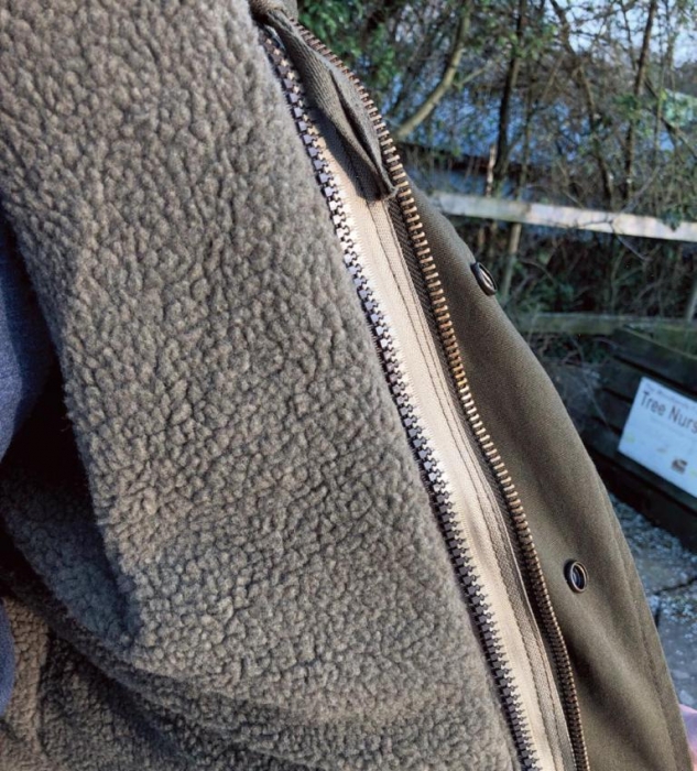 The jacket is done up using a heavy-duty brass zip and six tough press-studs. The jacket is lined with thinner cotton material and is warm in its own right but it comes with a brown, quilted polyester inner that is attached by zips and the sleeves have pressstud fasteners on the end of them to keep them in place. The inner, green material is quite ‘fluffy’, so is very warm and has its own draw-cord on the bottom. The inner can be worn on its own and has two zipped pockets.