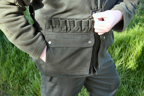 The waistcoat is manufactured from 35% cotton & 65% polyester and treated with Teflon to make it shower proof. It fastens by a zip with studded over flap. There are also lots of pockets – two large, lower front cargos with stud/flap with hand warmer slots behind. On either side of these are a pair of elasticated, open topped, ‘drop in’ pouches and above the left one is a handy D-ring. At the back is a washable, PVC-lined game pocket.