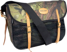 The Game Bag (of which there are many to choose from) is the recent re-designed version with full size front mesh pouch, leather strap and buckle fastenings. Measuring 16 ½ X 12-14” high (depending on game stored) it has a depth of 4”. It’ll take shells, waterproofs and still have space for your game.
