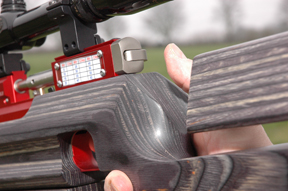 The newly revised, retractable forend hand support (or hamster if you must), has been extended to reach slightly further forwards than the original MKII version- a result of Air Arms constant canvassing of their top shots on the FT circuit. Again, chunky socket screws control the movement, and elevation can add significant height to the action. This section would come into play with the ‘over-the-arm’ FT position, or more commonly, be rested on the shooters knee for free-style shots. The approach to standing shots, can again be altered via this adjustment, until everything feels just right. My only gripe here would be that all adjustments require allen keys, rather than via an adjustment knob, which would be more user-friendly in the heat of competition. Accepting that these stocks are set and then left for the most part, the issue is minor.