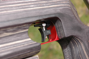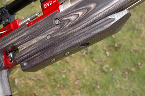 The EV2’s action now gets treated to a rather special nickel chrome plating, a finish I have to say, finally in keeping with its status. This highly durable, rust-proof finish isn’t a cheap process, yet the benefits are obvious. The matt satin look, contrasts nicely with the colour co-ordinated action parts, which can now be ordered in black, red, or blue. My test model came supplied in red, and with the muzzle brake, valve cover, and trigger housing sporting the anodized colour, the style is eye-catching to say the least.