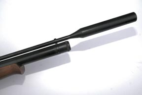 On the underside of the stock just forward of the trigger guard there’s a small air pressure gauge, telling you at a glance the fill status in the lengthy reservoir. To fill; unscrew the well-sized front inlet valve cover and push the brass cap quick fill adaptor onto the stainless steel inlet valve. Internally there’s a sintered disc for filtering any undesirable elements such as dirt, moisture or grime. Just squirt in the recommended 190-bar, which will give up to 80-full power shots in .177 calibre or just over 100 in the .22 calibre (as per the test rifle).