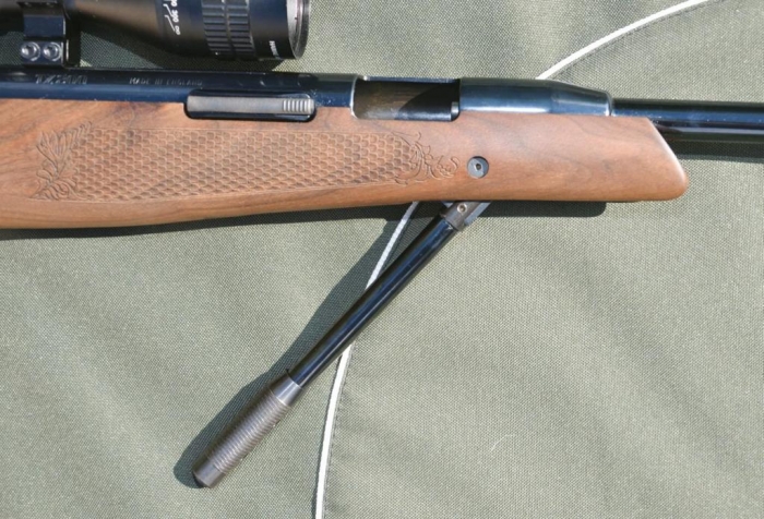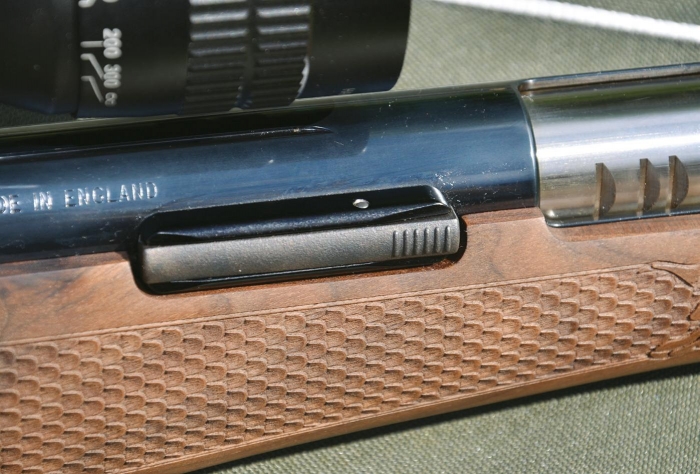 Cocking the HC is a fairly simple affair. With the butt placed securely in the groin, pull down and release the under-lever from its spring-loaded detent, and pull all the way down until the trigger and safety catch are heard to set. With the lever held firmly throughout (best practise with any under-lever airgun, irrespective of safety features!) push a pellet home into the lip of the barrel. Then push the Safelok bar, to allow the under-lever to be returned to its closed position.