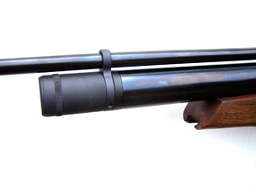 The barrel is a Walther of just over 14 inches in length (with an accuracy enhancing choked muzzle I believe). It is free floating above the air reservoir and readily accepts the supplied moderator.