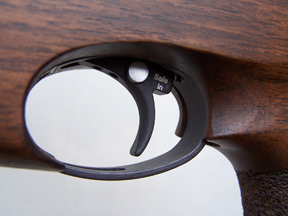 The trigger unit is an improved version of the old, having a crisper and readable let off that is achieved by the addition of another internal trigger sear. It is still a two stage affair, and now the narrow trigger blade has a simple cross bolt safety system fitted.