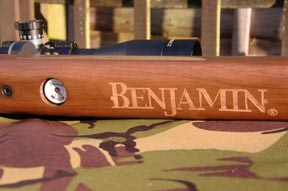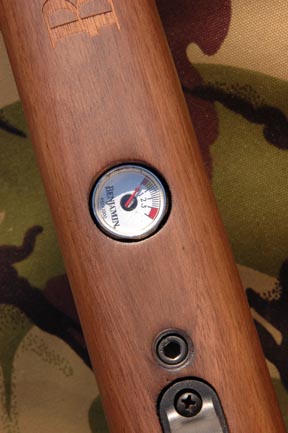 Stylish and angular best describes the woodwork; which manages to be refreshingly positive in its configuration, whilst at the same time totally ambidextrous. A nicely prominent cheek piece all but guarantees correct scope alignment, set off by a smart and functional rubber butt pad. The semi target grip is nicely scalloped away to leave a graceful slender section that feels just right in the aim; with the rosewood style cap and subtle chequered logo an added bonus. Not so subtle is the Benjamin brand name screaming out from the underside of the fore-end, in super size lettering. Alongside this, sits the on-board pressure gauge or manometer, which, in a rifle of this type, offers reassurance with regards to residual power levels.