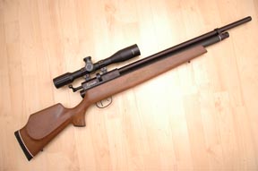 This new multi-shot Marauder cements the company’s ethos towards no-nonsense, rugged performers, and first impressions are of a solidly built piece of kit with purposeful styling. It carries a higher RRP than its Discovery stable mate, and takes Crosman’s venture into the PCP market a stage further; pitching them head to head with some serious European rivals. OK; the design is hardly revolutionary, but it does offer distinctive looks, given the full length hardwood stock and barrel/shroud arrangement.