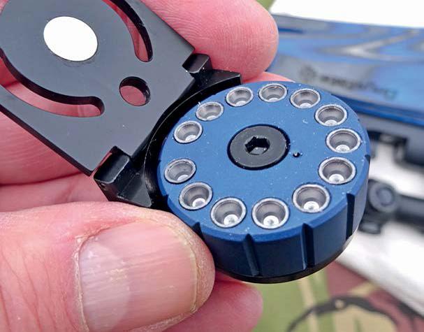 The Red Wolf models now come supplied with Daystate’s new gate-style magazine and this all-metal design has a quality feel. Just pull down the hinged side gate, rotate the drum and the first pellet can be dropped into the bottom centre. This locks the drum and all the chambers can then be filled. As usual, with the electronic models, the safety catch turns on the system and the trigger acts as a switch to program the power level (low or 12 ft/lbs), plus also adjusts the information on the LCD display - mag shot count etc.