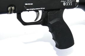 The sharp drop down pistol grip is military in design with front finger ridging and is manufactured from a very hand friendly rubberised ‘soft touch’ synthetic material. All combine to make the EB XVI surprisingly comfortable to hold and certainly affords the shooter a rock steady aiming platform.