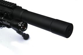 The test rifle came already scoped up with an Opti-42 10 X 42 Tactical scope with sunshade. With this large side parallax Target Turret optic sitting mean and moodily on the very lengthy top Weaver rail I soon set a 25-yd zero. Incidentally, these rails are actually the military NATO rated STANAG 4694 specification and design. Using the Edgar’s bipod (in this case when not in use fitted so the legs fold rearward so as not to interfere with the green dot laser also shown) I easily produced ragged one-hole groups out to 35-yds. The barrel shrouds silencer definitely doesn’t disappoint either with the rifle having only a whisper report due to the new design of polymer baffles.