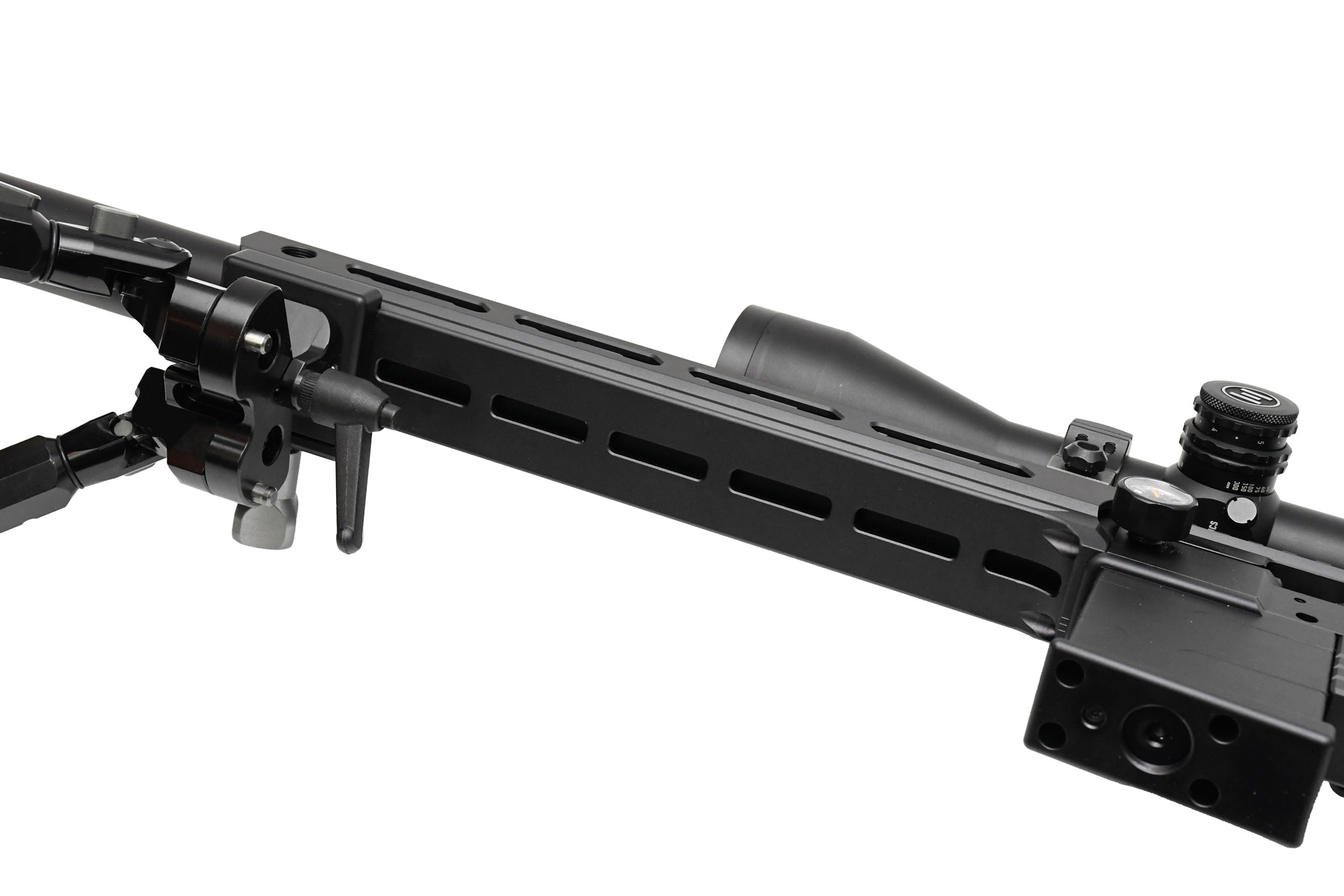 The “Sniper” model features a 700mm barrel, but options of 500mm and 600mm are available for those seeking a more compact, hunting-friendly platform. A threaded muzzle allows for the easy addition of a moderator after removing the end cap. The sleek, integrated barrel and air tube run into a 300mm (12”) long octagonal fore-end that fully free-floats the tube. It’s exceptionally rigid and ideal for accessory mounting. There’s a full-length Picatinny rail on top of the receiver for scope installation, and the fore-end includes both an ARCA rail below and M-LOK slots for further customisation. You won’t have stability issues whether you’re using a bipod or a tripod.
