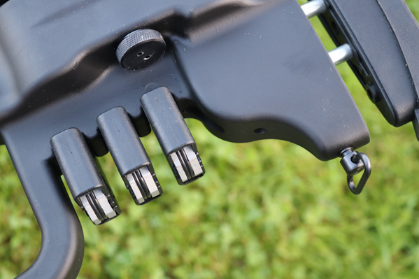 On the underside of the butt, just behind the thumbhole section, there are three cleverly designed magazine holders. These are simple and effective, and fully encase the magazines, ensuring they stay in position and remain dry, clean, and grime-free.