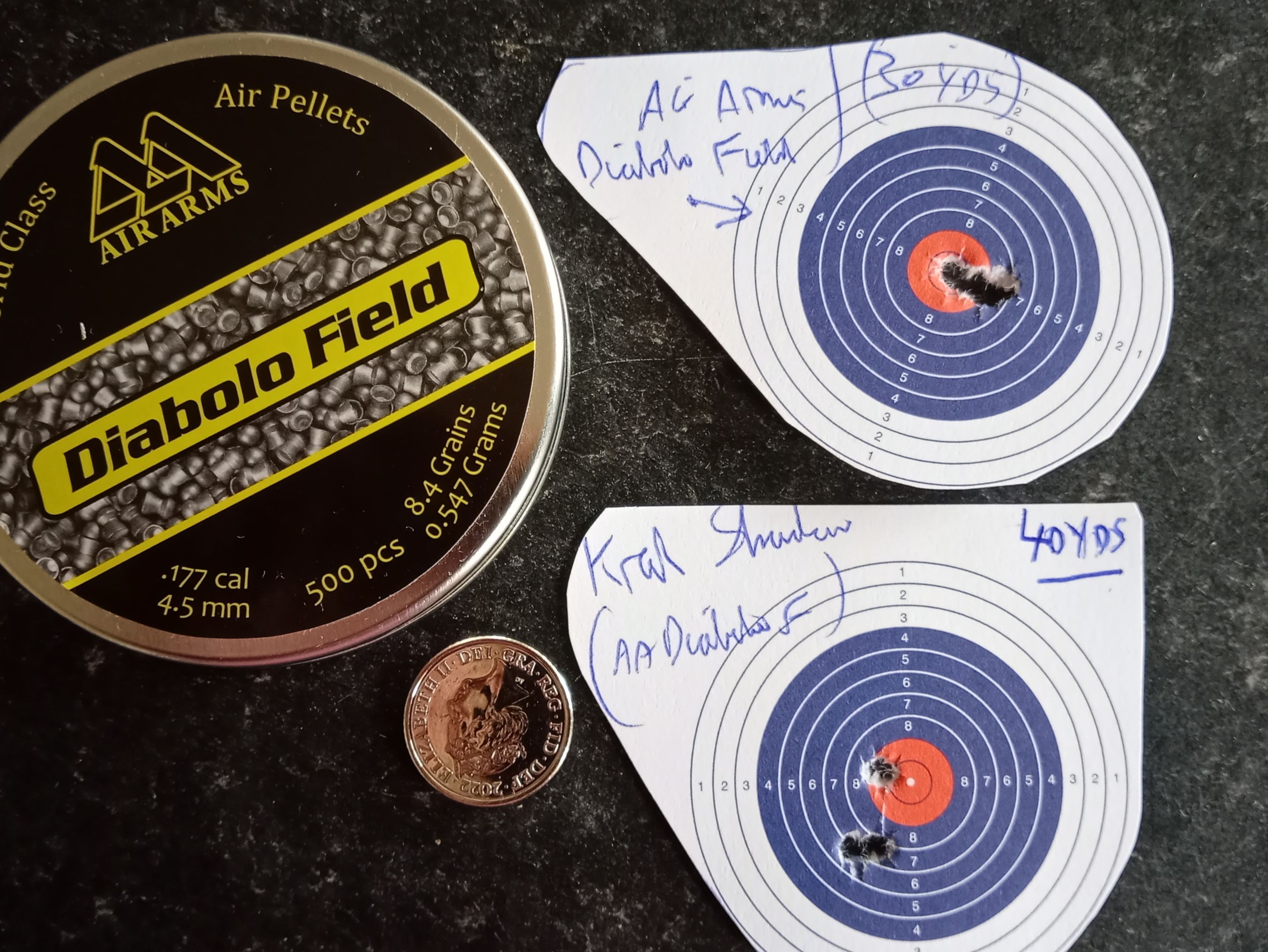 Exact RS Diabolo Fields grouped to 5p size, as did the BSA Goldstars, but the best by far were the Air Arms Diabolo Fields, which produced enlarged single holes and were therefore chosen to take back to 40 yards, which is probably the maximum distance for hunting if we’re honest with ourselves, and even then from an appropriately rested vantage point.