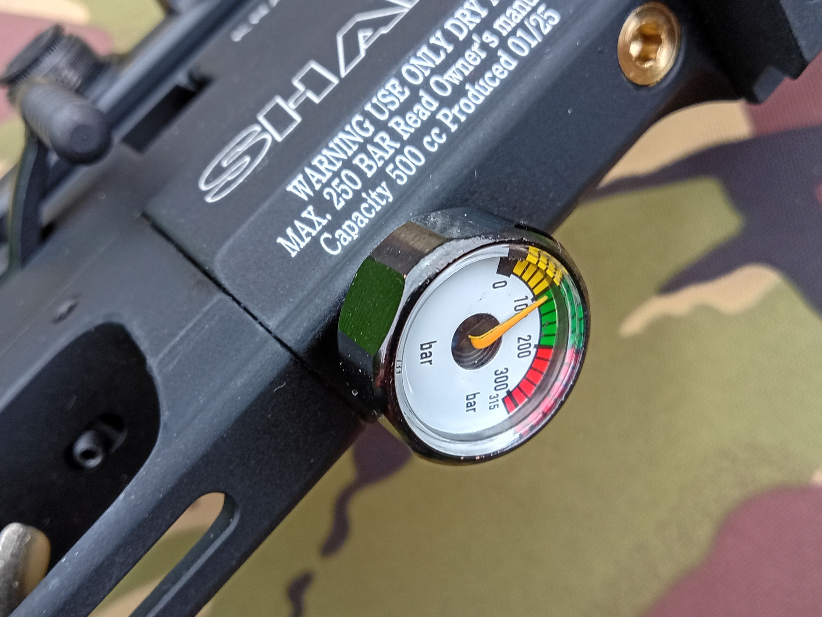 Time to see how the new regulator shapes up, from a full 250bar fill. Three magazines were used for familiarisation and zeroing the Shadow, giving a total of 42 shots. Glancing at the main cylinder gauge, the needle had hardly moved, sitting at 245bar.