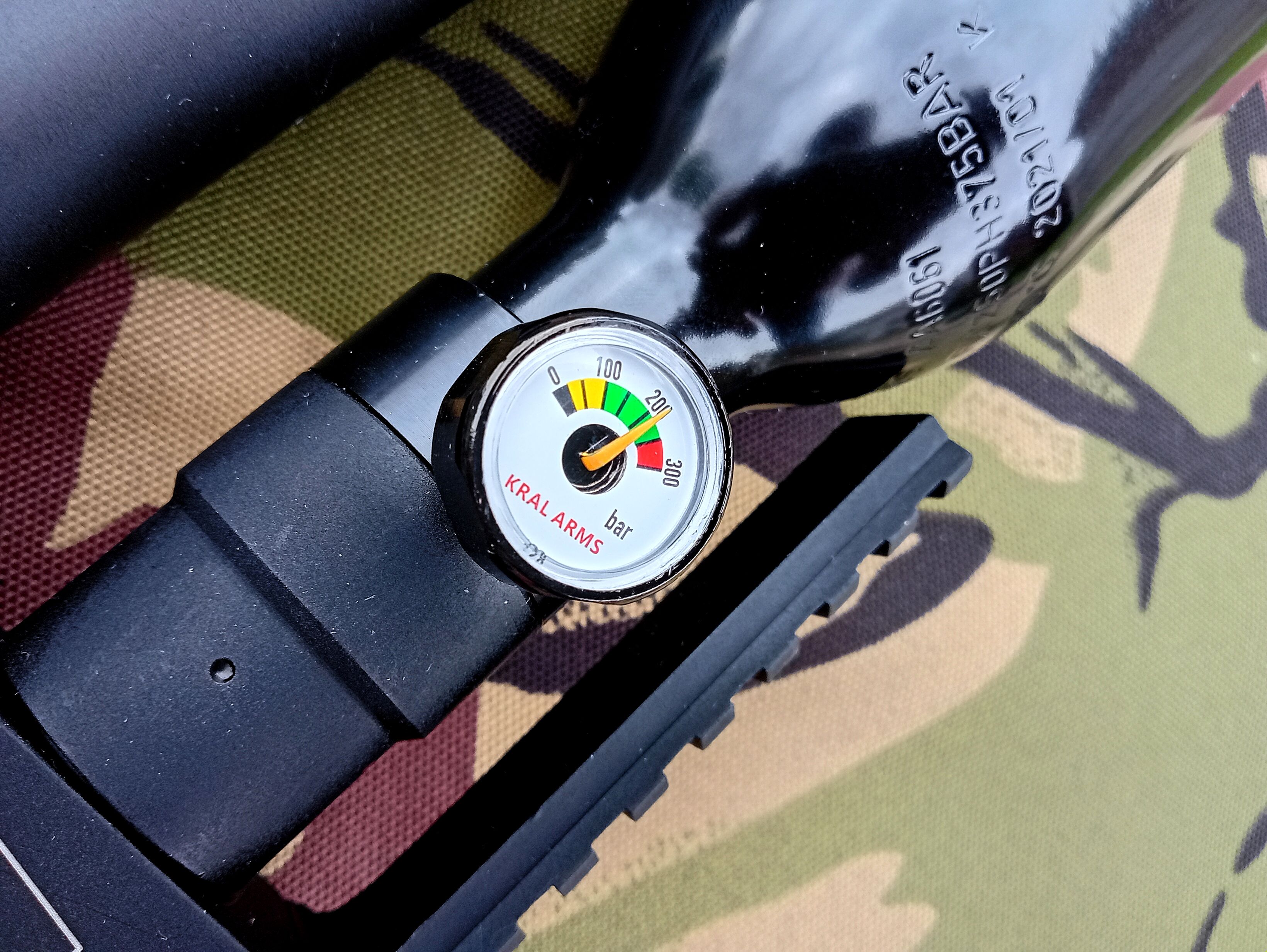 Kral fits the Shadow with twin manometers. There’s one under the block - weirdly proud and a bit exposed - showing the regulator pressure, which was set to 100bar on my test rifle, and another one mounted on the right side of the buddy bottle, showing residual main pressure.