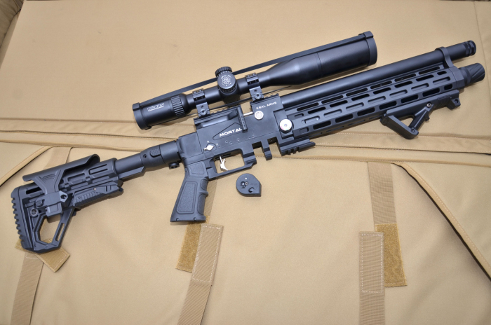 OK, a quick run-down of what we are getting for the money here. So, the Mortal is a multi-shot PCP that comes complete with two magazines, a single shot tray, and a filling adaptor. It comes fitted with a full-length shrouded barrel that’s threaded at the muzzle, Picatinny rail mounting, an adjustable trigger, side-lever operation, a manual safety catch, a manometer, and a power adjuster. There’s an AR-style pistol grip, and the tactical stock is not only adjustable but also folds.