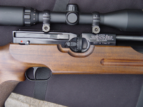 All the metalwork is well finished and the metal to wood fitting is first rate. As mentioned before, the early models had to have the air cylinder removed for filling, but this carbine can be filled either by this original method or via a bayonet connection just behind the air pressure gauge at the end of the air reservoir. The latter is obviously far more convenient for most applications. A small plug is usually supplied to protect the air cylinder from ingress of dust and grit, unfortunately it can’t be shown in the accompanying photos as it wasn’t included with the test gun. A brass cylinder end cap to protect threads and prevent leakage when the air cylinder is off the rifle, a brass filling connector (for direct cylinder to cylinder filling) and two magazines are also included in the package.