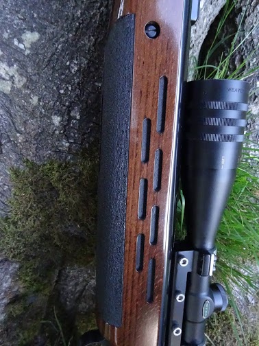 The stock is a beautifully dark finished Beech variety which has a very striking appearance and a multitude of form. The eye is drawn immediately to the large black wrap around stippling panels of the forend and pistol grip areas, which are very functional abrasive sufaces and provide a positive anti-slip hold. The forend has been treated to a “ventilated” design, often recognised as features on serious competition rifles. Although semi decorative, these ventilations do help to reduce weight of the forend, provide a secondary grip area, and really do play an important role in the whole serious image of the gun. There is an adjustable butt plate at the rear and the bonus of an adjustable Cheek piece too, so the fit can be tailored to the shooters ergonomic requirements and different shooting styles. The cheekpiece is adjusted by releasing two recessed allen grub screws, sliding the comb up or down on the steel rods, and retightening the screws. This is a simple operation and the quality of the whole mechanism ensures easy and accurate height adjustment. The black rubber butt pad is nicely curved, which fits well in the shoulder. The pad adjusts on two interlocking alloy plates, locked together or released by using a flat blade screwdriver. On the whole, the stock is very well designed and the style really highlights the functional intentions of this multi-purpose specialist.