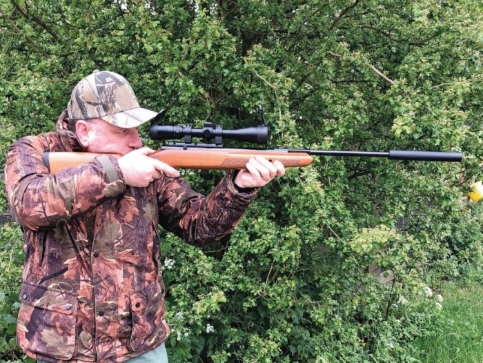 Next up, is what you could call the ’45 deluxe’ but is in fact called the 45-RS, ‘R’ for rail and ‘S’ for silencer. The RS, at £269, shares the same action as the standard 45 but with the added extras above. The top of the action has a rail fitted, which raises the sightline and no open sights are fitted; the silencer is fitted to the shortened, 12¾-inch barrel; the silencer is removable (for barrel cleaning, for instance) as it is fixed via a ½-inch UNF thread. The rifle is obviously much shorter with the silencer removed but produces a bit of a crack without it – far better to use it with in place, that’s the whole point after all!