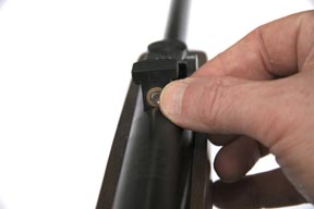 What at first appears to be a rotary breech lever is in fact a ridged pop-up breech pellet loader – very similar to the assembly used on Weihrauch’s HW57 rifle. On cocking the CF-30 this automatically ‘pops-up’ for you to directly load a pellet into the brass lined plastic pellet loader, then you need to manually push it back down to its original ‘flush’ position just to the rear of the rearsight unit. On returning the under-lever the rifle is now cocked and loaded, so I’d advise you to use the manual safety blade set forward of the main trigger blade - a familiar Gamo trigger layout. I mention this here because the ‘auto’ pellet loader can be pressed down with the rifle cocked and in the closed position. In other words you can cock the rifle, return the lever, load the pellet loader and leave it in the ‘up’ position. Don’t be tempted to do this - in effect using this as a ‘secondary or primary safety’ - as you’ll end up dry firing the rifle on more occasions than you might imagine…