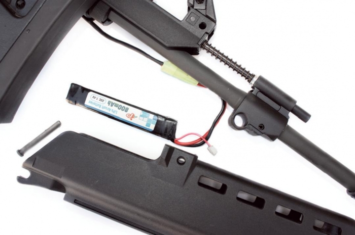 The KURZ comes with a single 470 round high-capacity magazine; this again neatly mimics the real thing as it has a semitransparent finish. It also has the mating lugs so that two or more magazines can be joined solidly together side by side. The battery compartment is found by removing the forward body pin and simply sliding off the entire forestock. There’s enough space for a reasonably sized battery, and in the compartment you’ll also see a really nicely finished fake gas block, piston and barrel locking system!