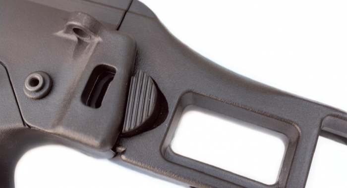 The setup of the KURZ is very ergonomic, as you would expect of a modern battle rifle with very few sharp edges. Everything is slightly rounded off so it feels great in the hands. The pistol grip has a very comfortable angle, and the side-folding skeleton stock has a very nice rubberised pad; with the stock folded to the right-hand side the overall length of the carbine is reduced significantly for ease of transport and storage. The controls are fully ambidextrous for safe, semi and auto, the modes being indicated by bullet pictograms in the ‘navy’ style.