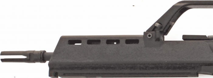 The carbine itself is based on the ARES G36, which means that there are some great things going on internally. It’s also a fully licenced replica which means that all of the trademarks used by Heckler & Koch are present and very nicely achieved, along with a unique serial number. The back polymer body (reinforced nylon fibre in this instance) is very nicely finished and looks exactly like the real thing; where there should be metal parts they are where they should be, including the distinctive KURZ flash hider. The flash hider is on a standard 14mm clockwise threaded one piece aluminium outer barrel, so it’s easy to remove should you wish to fit a suppressor.