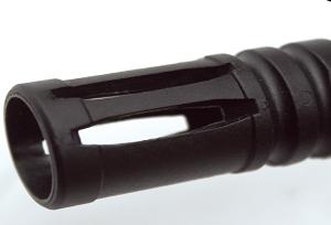 The hop-up adjustment lives underneath the dust cover at the upper right of the ‘bolt’, again as usual, but as I said before, this is Tippmann’s own design and needs an Allen key for adjustment. CW increases the amount of hop, and CCW decreases it, and believe you me, once it’s set it stays set! As standard the Tippmann has a ‘Delta Ring’ off the upper receiver and a mock gas block, extended rail affair at the front, which keeps a plastic rail-mounting system securely in place. The rail-mounting system comes with a fixed length section at 12 o’clock, but at 9, 6, and 3 you have the option of fitting longer or shorter rail sections, again all of which are included. Unlike most rail systems, the Tippmann version splits left to right rather than top to bottom and in fairness feels a little brittle. At the sharp-end is a standard M4 style ‘birdcage’ flash hider, which sits on a 14mm CCW thread, which is compatible with most aftermarket parts; in the USA Tippmann are legally bound to deliver replicas to their users fitted with a blaze-orange flash hider, so I’m guessing they know that this part will be replaced anyway.