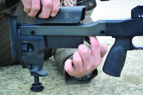 The trigger is a bespoke unit offering the characteristic two stage operating style favoured by police and military. It can be adjusted for weight and position and showed a slender serrated blade that was easy to adjust to sit under the pad of my finger. The pistol grip is an AR15-type and is easily removed/replaced for something else of the same fitting, which is an excellent feature. Generous enough for a gloved finger, the aluminium trigger guard is part of the stock and flows into a 6-round detachable magazine with an ambidextrous release catch on the front edge of the guard. Easily operated and well sprung the mag free falls with no assistance.