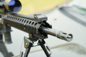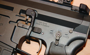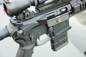 The upper in this case features a functioning case deflector and forward assist, which will not appear on the side cocker as the ejection port is lengthened. As standard the action offers the following features: trigger Geiselle 3-Gun, safety / selector and magazine release Knight Armament’s ambidextrous-types, bolt release ambidextrous via Magpul BAD lever. The pistol grip is a Magpul MIAD and the rifle comes with a 20-round P-Mag. The 4-way, free-float forend will be a Daniel Defense 12” AR15 Lite Rail II, the tester had a 13” Troy unit fitted, which will not be offered. The butt will be a Vltor A5 7-position extension with E-MOD stock, which gives a bit more LOP for those with long arms.