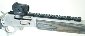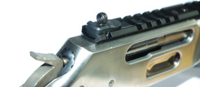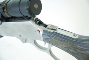 The action is standard 1895 with a cross bolt, hammer block safety and a 2-position half and full cock external hammer. Loading is by a gate at the forward/right of the receiver and the bolt is grooved doubtless to improve operation in adverse conditions. Marlin included a day-glow orange magazine follower too. Compared to the standard rifle there are two major changes. First there’s an 11.25”, Weaver-type Lever Rail on top of barrel and action, secondly the traditional elevator wedge, semi buckhorn and ramped front blade have been binned. In their place is a removable, fully adjustable XS Ghost Ring aperture at the rear and a heavy, fixed blade on a block up front. In terms of usage this gives faster acquisition and an improved sight picture for when irons are required.