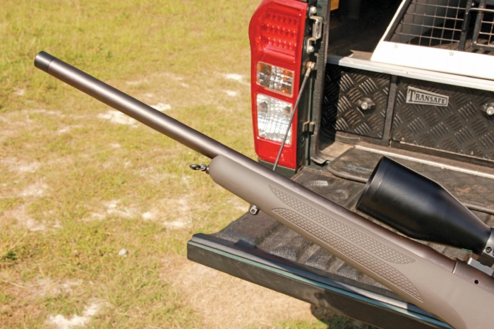 The control layout and build are also conducive to easy operation. The bolt shows a large diameter body that just glides open and closed with no hesitation or stiffness. Equally the large bolt handle with its big ball end aids this operation as does its short lift angle. Feed is smooth and certain and ejection not an issue as the empties fly out of that large port powered by the twin plunger system. The safety offers three positions – forward FIRE, middle SAFE with bolt operation and rear SAFE bolt locked. It’s positioned a bit like the Win Model 70 and its drop-down lug is operated easily enough by the firing hand thumb with a little disturbance of the firing grip! At the rear of the shroud is a cocked action indicator pin; always a bonus!