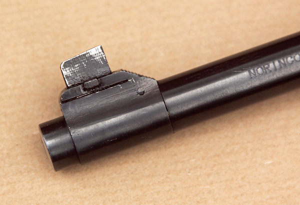 The stock is likely beech rather than walnut but is nicely finished in a deep brown gloss, with good clean edges, although the visible cutouts are a little rough, and the wood to metal fit is very nice. All of the metal parts are black, apart from the security bar discs in the butt, which are left in the white. There is a bayonet lug on the underside of the barrel but I am unsure as to whether this is purely cosmetic or whether a bayonet can be sourced to fit.