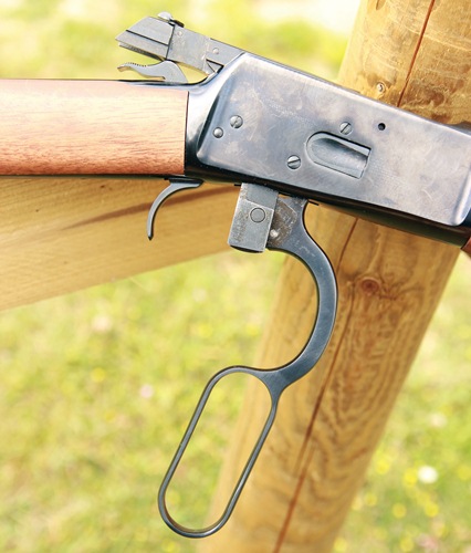 The basic layout went for a 20”, round/ light barrel with muzzle and forend bands and hardwood furniture. The forend was slim and of standard length with a straight-hand butt. The receiver was solid-based with a round profile with a single-piece operating lever which controlled two rising locking lugs that engaged at the rear of the action. This design was first introduced by Browning with the Winchester 1886 and was simpler and stronger when compared to the toggle locking system of the earlier 1866, 1873 and 1876 guns.