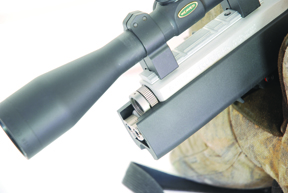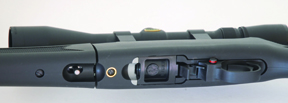 The new TakeDown comes complete and looks essentially identical to the 10/22 stainless synthetic gun. The only give aways are the small gap between the forend and rest of the stock and the slotted barrel collar at the front of the action. Turning the rifle over you can clearly see the locking catch that allows you to disengage the butt/receiver section from the forend/barrel assembly. As we shall see a quick pull and twist movement is all that’s needed to do the job. Ruger also includes a neat, little backpack bag for the components to travel in.