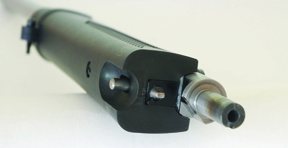 The lock up consists of a plunger in the forend with a chisel nose that engages with a locking block at the front of and under the action. The other major piece of re-design is the barrel, at the chamber end is turned down to offer a slim, parallel section (chase) that slides into the receiver. Initial assembly requires a set-up adjustment, but after that the barrel is just put in and out.