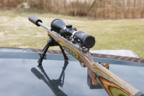 The stock shows a sporter-style build with a slim neck and low comb; at the rear is a spacer and thin rubber recoil pad, extending the LOP would not be too much of a problem. The forend is neither too wide nor slim; it does not however float the barrel full length, which I would have done as a matter of course. QD sling studs are fitted and chequering applied front and rear. Though cosmetic the Green Mountain Camo is a nice look and far preferable to my HMR’s original black/grey furniture! Another good aspect of laminate is that it’s more stable than real wood!
