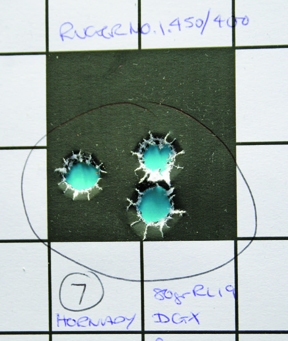 The Hornady DGX gave 2030 fps/3661 ft/lbs and was the best load with this bullet and at 60 yards, typical ranges for this type of rifle, it grouped three shots into an inch nicely. The best groups went to the Woodleigh 400-grain Soft points with 80-grains of Reloader RL 19 giving 1974 fps/3462 ft/lbs energy with tight three shot clover group. Solid bullets were less accurate at 1.5 -2.25”; but a Cape Buffalo is a big target and penetration would be your main concern.